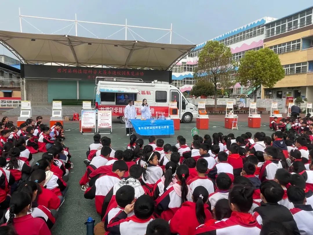 前不久,河南省南阳市唐河县昝岗乡中心小学的学生正在跳操时,一辆满载科学道具的大巴停在了操场边。大课间一结束,大巴周边围满了来看热闹的学生们。
