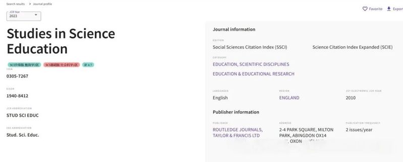 《Studies in Science Education》由 Taylor & Francis 集团旗下 Routledge 出版社出版,是SSCI、SCIE 双收录的国际权威期刊,也是科学教育领域最具代表性的专业综述期刊。该刊以发表最高水准的批判性与系统性综述论文为核心使命,聚焦科学教育关键议题的研究整合、理论反思与前沿研判,不刊发单一实证研究,专注做领域知识的 “提炼者” 与 “领航者”。期刊坚持严格同行评议,秉持学术标准与全球视野,鼓励多元背景、多国学者发声,既沉淀成熟研究领域的学术积累,也开拓新兴方向的研究版图。其成果面向科学教育研究者、硕博研究生、中小学与高校科学教师、政策制定者、课程与教材开发者,为全领域提供理论框架、研究脉络与实践启示。
